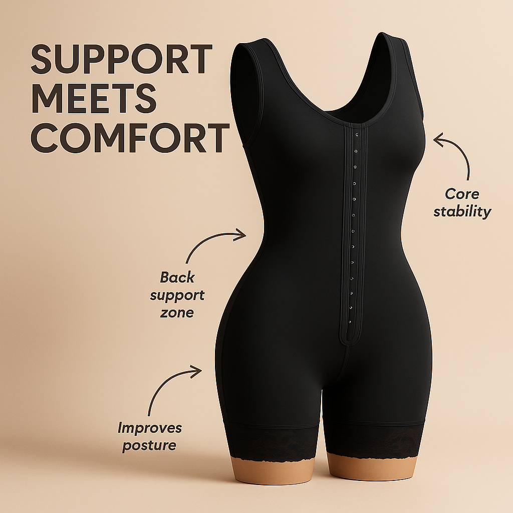 This full-body shapewear gently aligns your back and core, helping reduce pressure on your lower spine. The balanced compression supports healthy posture, eases daily tension, and promotes better body alignment — whether sitting, standing, or moving.